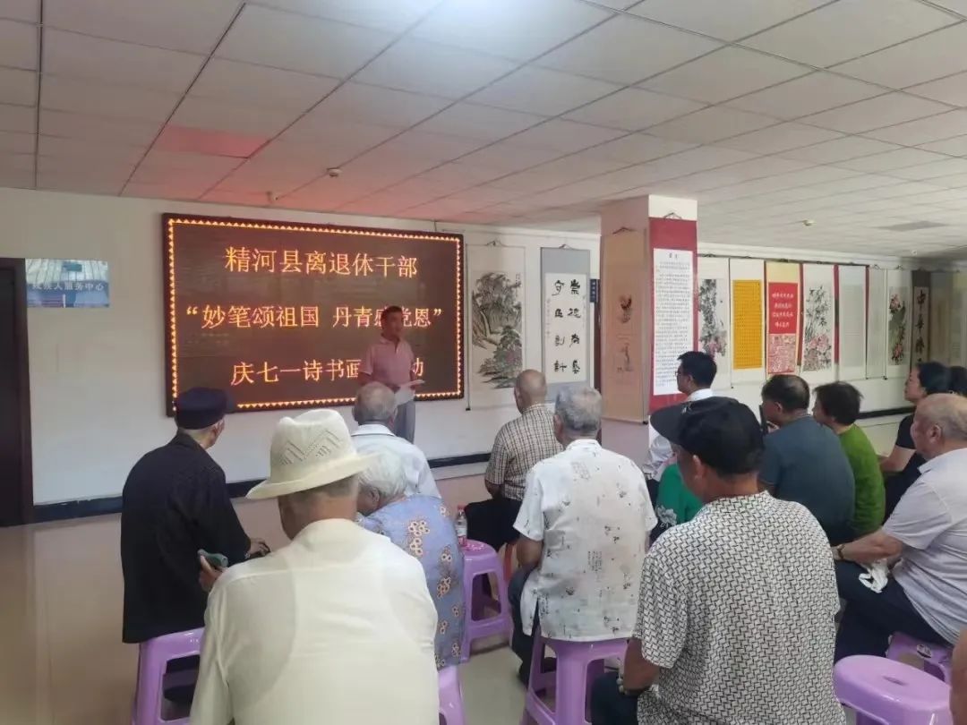 7月1日,精河县老干部诗书画学会在老干部活动中心举办“妙笔颂祖国 丹青感党恩”诗书画作品展,部分离退休干部以及书画爱好者50余人参加活动。活动中,书画爱好者们在各类作品前细细品味,或拍照留念,或与其他书画爱好者交流作品的独特之处。