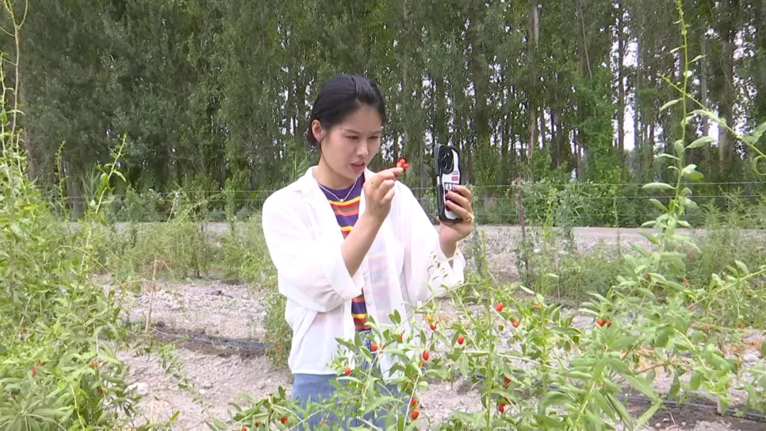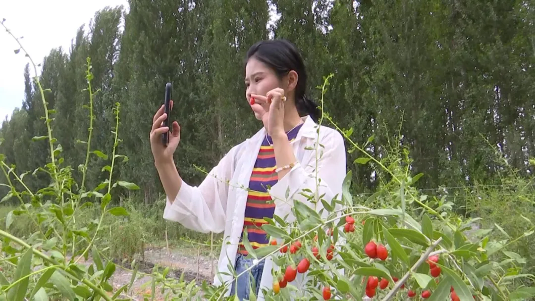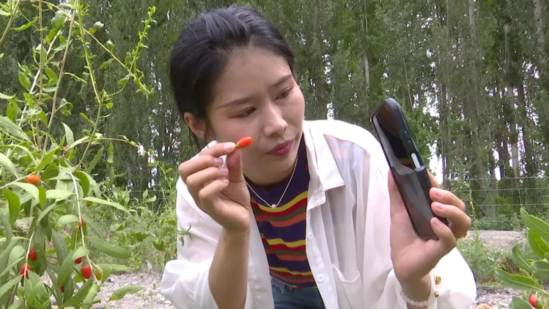 张瑶瑶说:“大家看一下我手里的枸杞鲜果,粒大饱满,皮薄肉厚,精河县位于北纬44度,每天日照时间长达16小时,所以精河的枸杞口感非常甘甜......”