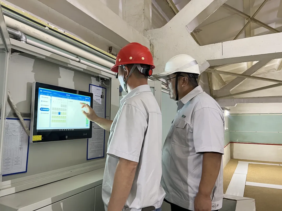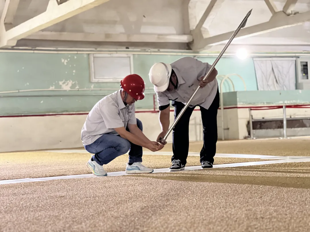 徐长炯介绍说:“现在看到的是高大平方仓,仓内面积约1200多平米。粮面以下预设了近300个粮情测控点,确保粮温粮情变化能随时监控。主要保粮措施是内环流控温系统,身后的五个环围管道正在通风,仓内温度基本控制在24度左右,所以进入仓内会感觉很凉爽。冬季去热通风蓄冷,夏季开启内环流系统,将粮堆内部冬季蓄冷的冷源通过内环流抽到仓内再下行,形成闭环环流,能很好地保证粮食保管品质。”