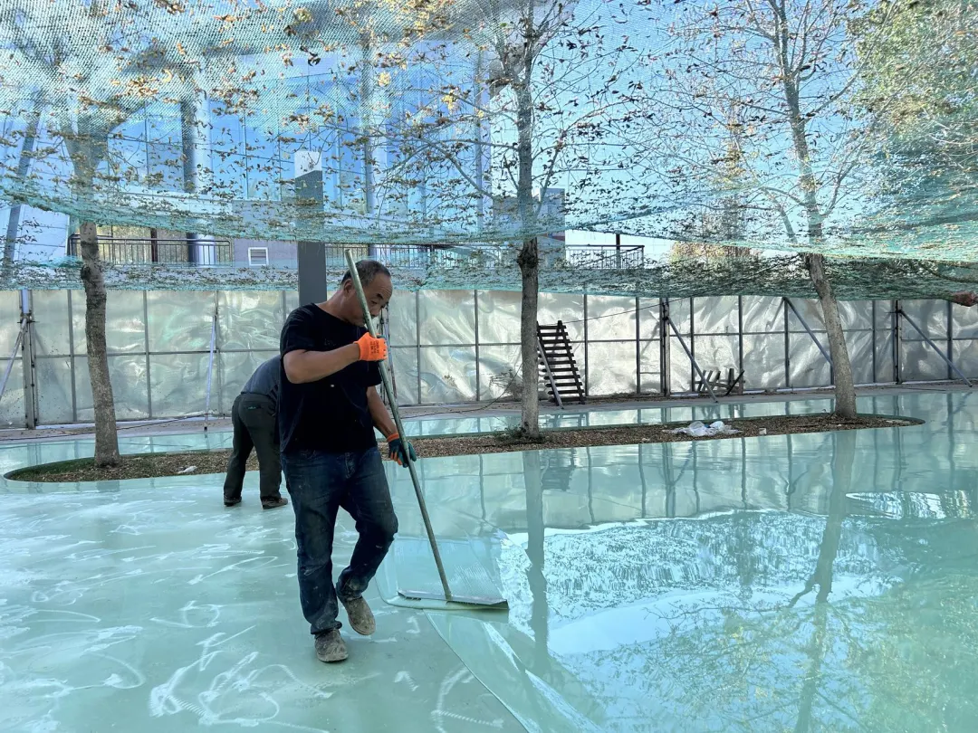 近日,在体育馆场外施工现场,工作人员正在进行地面坪漆的粉刷工作,后期将安装健身器材和设备。