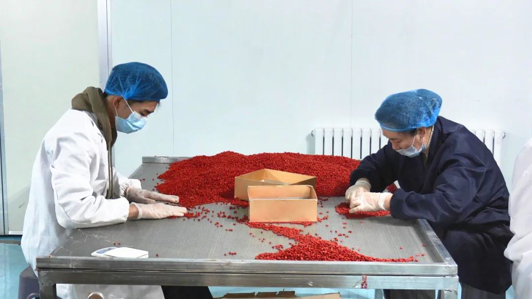 与此同时,新疆杞明星枸杞产业发展有限公司生产车间内,一条条生产线正全力高速运转,一袋袋枸杞干果正从生产线上不断产出,工人们正忙着分拣、包装,现场一片繁忙景象。该公司车间主任许莲芳说:“春节期间,我们企业正常生产,线上正常发货,主要储备的是春节的礼盒装、大礼包等产品。”