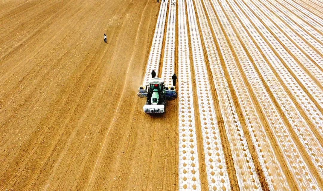 近日,在托里镇乌兰旦达盖村村民王健的辣椒地里,3台装有北斗卫星定位导航系统的大马力铺膜机正在来回穿梭进行播种、铺膜作业。随着机器的前进,滴灌带和地膜井然有序地铺展开,田间地头一派忙碌的春耕场面。王健说:“我今年种植了700亩辣椒,预计3天左右就能完成播种。”