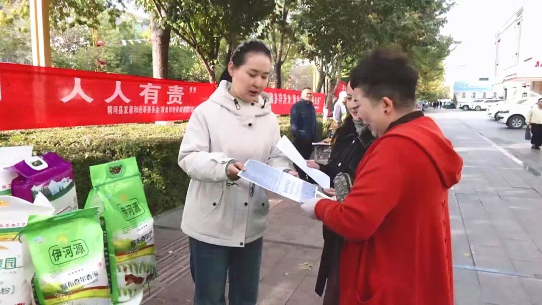 在第45个国家粮食日到来之际,10月14日,精河县发改委联合县委宣传部、县农业农村局、县团委、县妇联、县市场监督管理局等多部门,及相关企业共同开展2025年“世界粮食日”与“全国粮食安全宣传周”宣传活动,以多元形式传递粮食安全理念,进一步凝聚全社会爱粮节粮共识,为保障粮食安全注入基层力量。