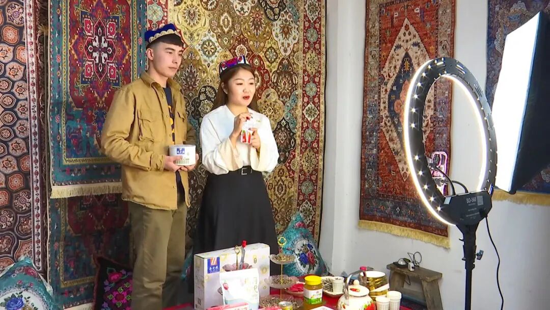 近日,在精河县电子商务公共服务中心举办的电商直播带货活动中,电商主播古丽鲜·托合提正在手持产品积极与线上网友互动。直播间人气不断攀升,订单接连产生。