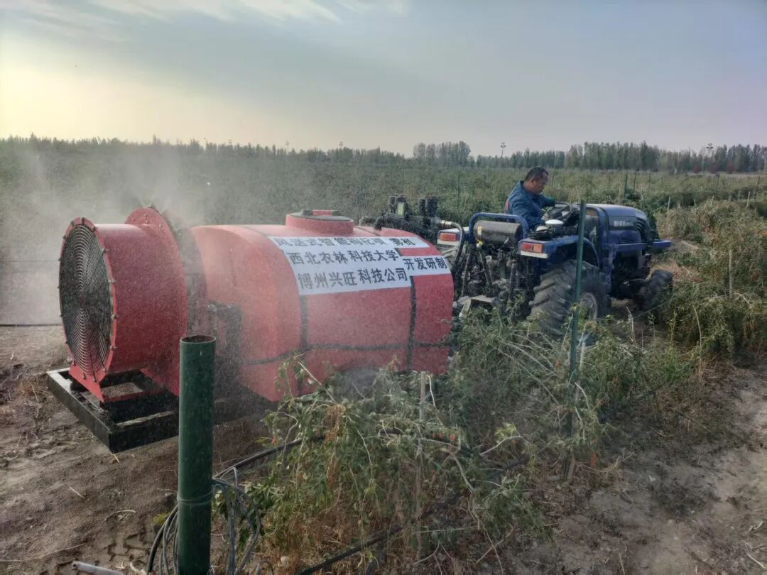 为适配精河农艺,团队扎根田间地头。白天观察枸杞生育期叶片状态、记录沙质土壤对机械通行的影响,夜间拆解传统设备图纸、对比喷头雾化数据,最终联合博尔塔拉蒙古自治州兴旺科技有限责任公司,量身打造出风送式精准喷雾机。