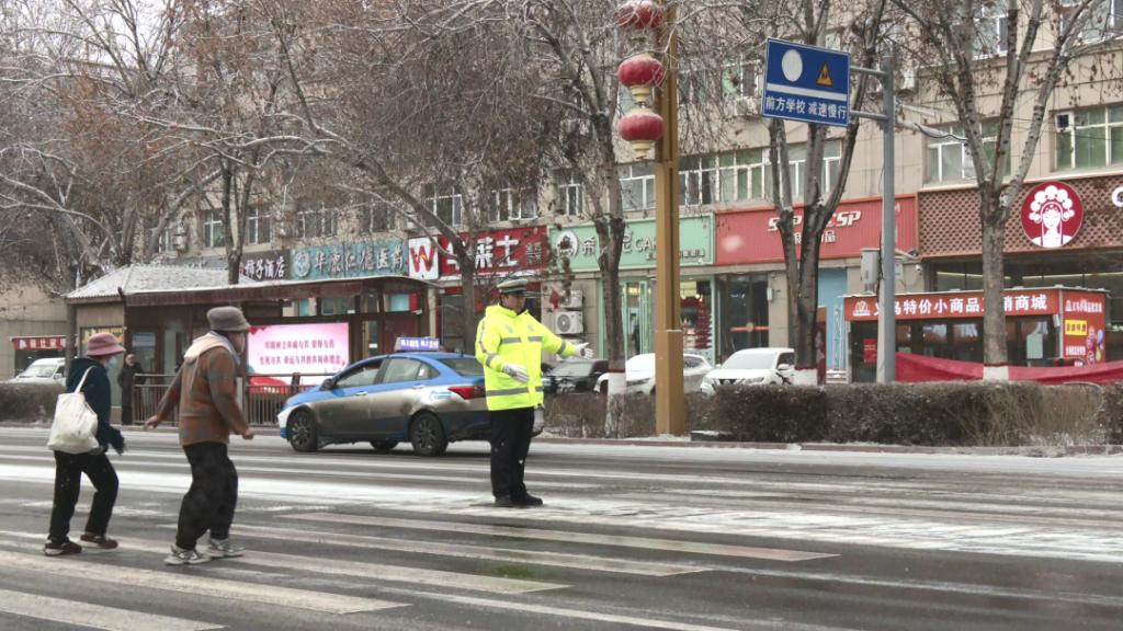 在县城友好时代广场十字路口,精河县公安局交通管理大队民辅警们分工协作,有序开展交通疏导工作。部分警力坚守路口引导车辆安全行驶,提醒驾乘人员减速慢行;另一部分警力则相互配合,撒布融雪剂、清除道路中间影响车辆通行的积雪,全力保障降雪天气下的道路交通安全。