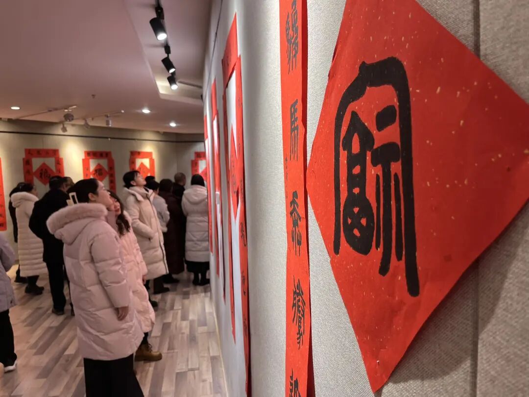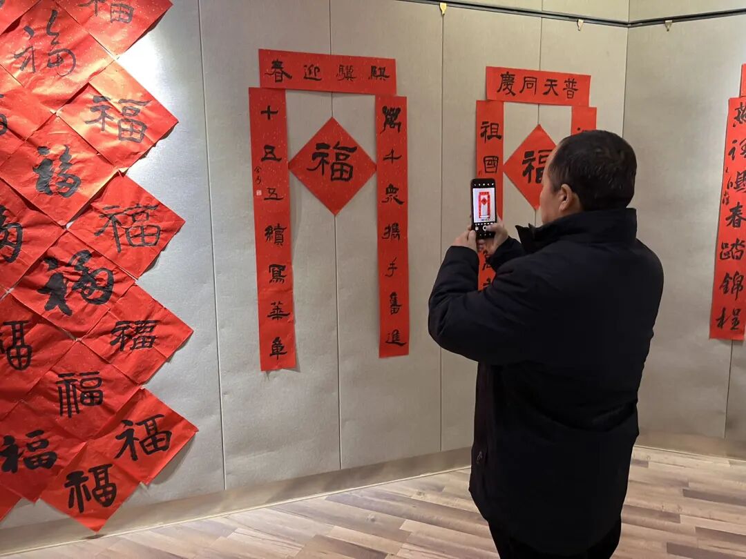 开幕式上,县文体广旅局介绍作品展收稿情况。与会领导现场为居民代表送上了春联和祝福,传递了新春的美好祝愿。随后,大家共同参观展览。春联书法作品“万千众携手奋进十五五续写华章”、“银蛇漫舞送冬去金马奔腾迎春来”、剪纸作品《马到成功》、农民画作品《收获》……红彤彤的春联、栩栩如生的剪纸、各式的“福”字,洋溢着新春的喜气。