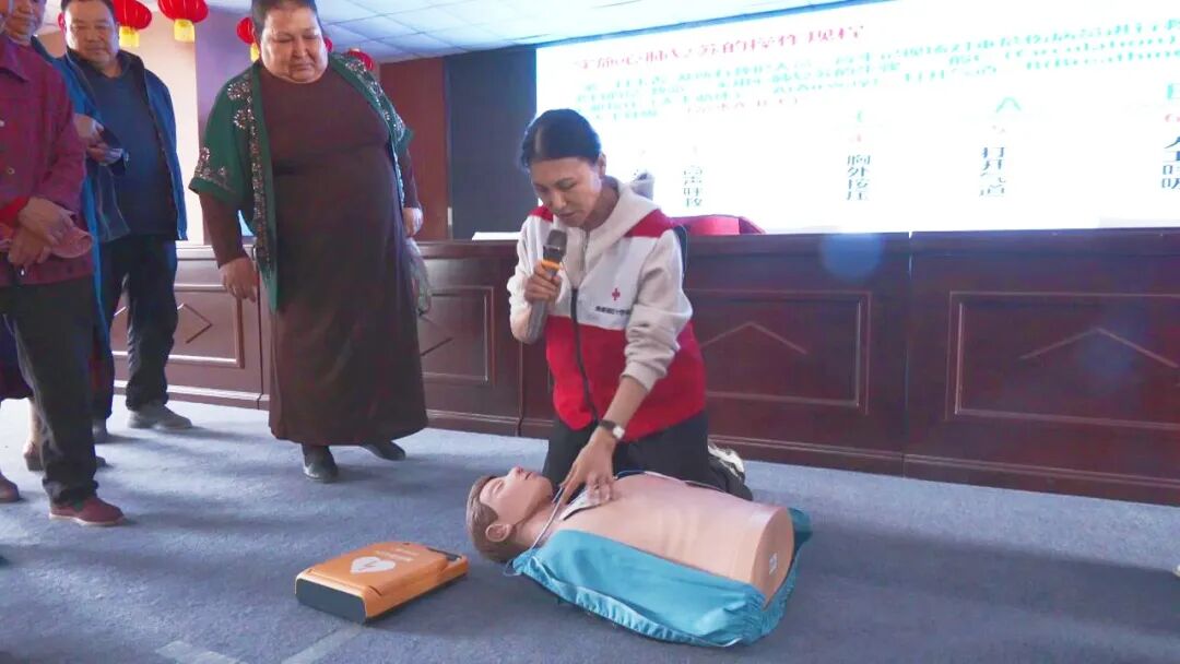 “遇到气道异物梗阻该怎么办?”“心肺复苏如何正确操作?”活动中,县人大代表、县红十字会副会长吴建霖围绕应急急救知识开展专题培训。她详细讲解心肺复苏、海姆立克急救法等实用技能,现场演示操作步骤,并组织群众逐一实操练习,手把手指导纠正,让大家真正掌握“救命本领”。