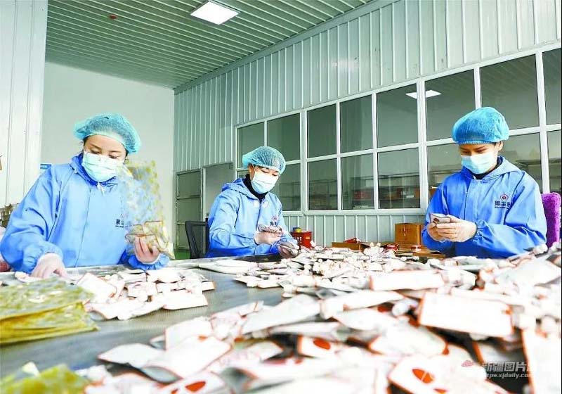 在博尔塔拉蒙古自治州精河县杞瑞生物科技有限责任公司生产车间里,工人正在分拣包装“枸杞原浆”(1月7日摄)。(摄影:赛永杰)人工拣选、超声波清洗、原料粉碎、过滤杂质、加入啤酒花和酵母、啤酒灌装……2月18日,新疆博尔塔拉蒙古自治州精河县杞瑞生物科技有限责任公司的枸杞啤酒加工车间,十几名工人正在生产线上忙碌着。