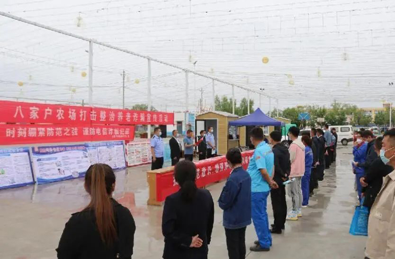 精河县八家户农场多措并举开展“线上+线下”打击整治养老诈骗系列宣传活动,举办了以“提高防骗意识 增强防范能力 构建电信诈骗‘防火墙’”为主题的承诺签名活动,活动现场,县公安局刑侦大队教导员王海波以真实案例为切入点,用通俗易懂的语言向大家讲解发生在身边的电信诈骗;精河县基层“网红达人”李红英,通过开设全程直播进行“云宣传”,使反诈知识更加深入人心。