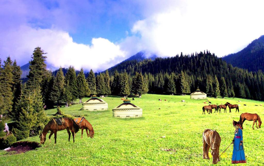 在景区大门处,分东、西沟进入景区。东沟风景如画,视野开阔,是土尔扈特部落后裔的居住地,蒙古族特色文化和民俗风情浓郁,远方的亲朋到来时,热情好客的主人宰羊、煮肉、做那仁等,按传统风俗习惯唱歌敬酒、献哈达等迎接客人。坐在草地上,沐浴着纤尘不染的阳光,成群的牛羊、皑皑的雪岭、陡壁巨石,毡房木屋、炊烟袅袅勾勒出一幅壮美的民俗风情画卷。从西沟进入南行,通过木栈道可途经犹如展翅凌空搏击的飞鹰瀑布,沿1500米盘山道继续南行到达素有“云中草原”之称的都拉洪草原,该草原地势平坦,云杉如海、奇峰林立,怪石、清流、白雪融为一体,勾勒出一幅壮美的自然画卷,山风拂过,让人思绪清爽,浮想联翩,是休闲避暑的天然胜地。