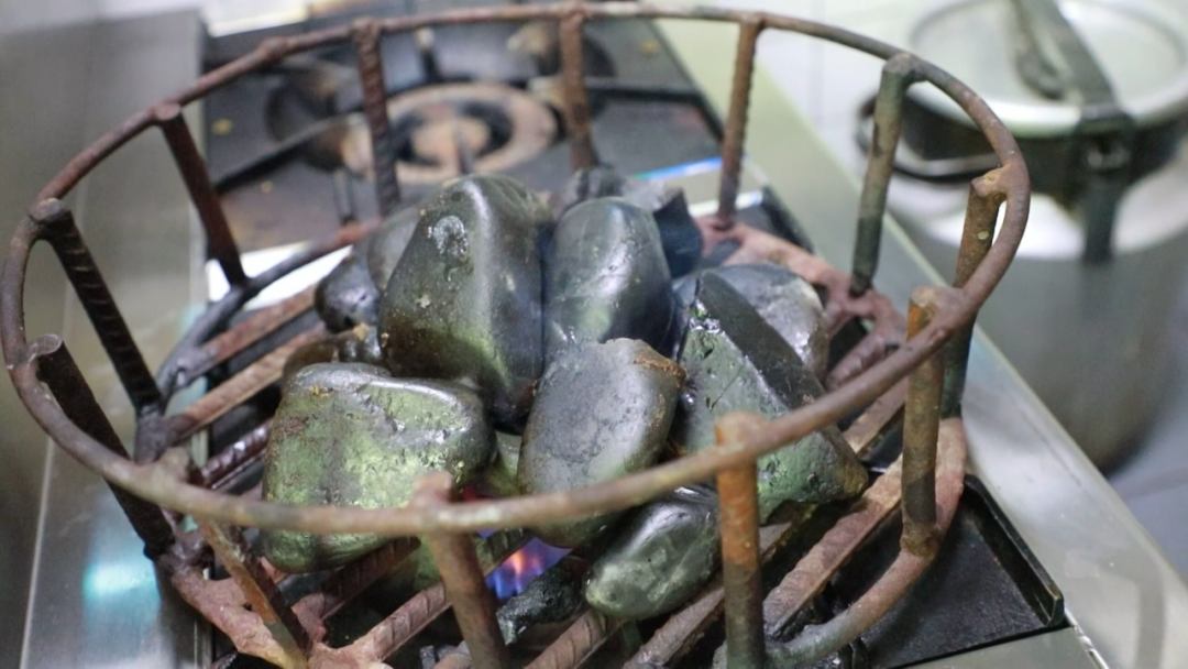 8月10日,在精河县新疆特色名吃一条街东归牧人餐厅,巴·阿拉正将取自河中的鹅卵石加热烧红,通过独特的手法,放置在特殊的容器里进行焖制。巴·阿拉介绍说:“做石头焖肉大概需要小火慢炖一个小时,其中火候和时间都非常重要,掌握不好口感就不对了。”