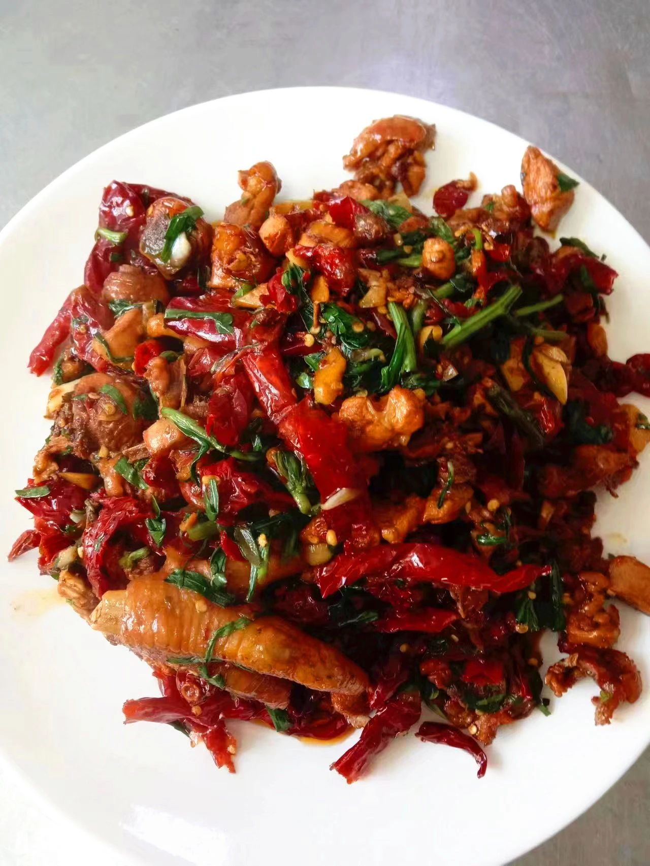 整个制作过程大概在20分钟左右,没有我想象的那么复杂,没放老抽、生抽、耗油,甚至连葱段都没有放。而装入盘中的辣子鸡,色泽鲜亮,香味四溢。鸡肉块呈金黄色,辣子皮也变得油光发亮,点缀少许白色蒜末,辣子的红色和鸡肉的金黄色完美搭配,不知不觉我已口舌生津。
