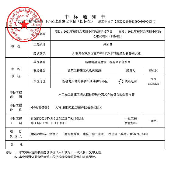 2021年精河县老旧小区改造建设项目(四标段)中标通知书