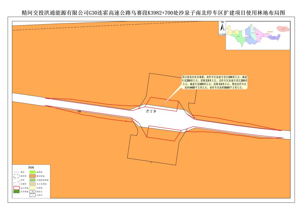 精河交投洪通能源有限公司G30连霍高速公路乌赛段K3982+700处沙泉子南北停车区扩建项目拟使用林地位于精河县茫丁乡直属10林班21、162小班,共计1个乡镇1个林班2个小班。具体位置如图所示: