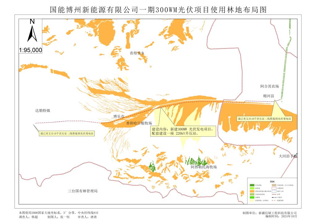 国能博州新能源有限公司一期300MW光伏项目配套附属工程拟使用林地选址具体位置如图所示: