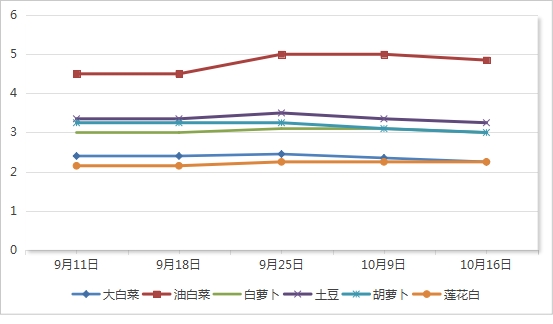 大路菜平均价格3.1元/公斤,与10月9日相比下降2.82%,与2025年9月18日相比下降0.32%(0涨5降1平)。其中:莲花白价格2.25元/公斤,与10月9日相比持平,与2025年9月18日相比上涨4.65%;土豆价格3.25元/公斤,与10月9日相比下降2.99%,与2025年9月18日相比下降2.99%;油白菜价格4.85元/公斤,与10月9日相比下降3.0%,与2025年9月18日相比上涨7.78%;白萝卜(象牙白萝卜)价格3.0元/公斤,与10月9日相比下降3.23%,与2025年9月18日相比持平;胡萝卜价格3.0元/公斤,与10月9日相比下降3.23%,与2025年9月18日相比下降7.69%;大白菜价格2.25元/公斤,与10月9日相比下降4.26%,与2025年9月18日相比下降6.25%。