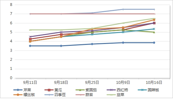 精细菜平均价格5.95元/公斤,与10月9日相比上涨5.31%,与2025年9月18日相比上涨16.44%(5涨1降3平)。其中:螺丝椒价格6.35元/公斤,与10月9日相比上涨15.45%,与2025年9月18日相比上涨41.11%;黄瓜价格6.0元/公斤,与10月9日相比上涨14.29%,与2025年9月18日相比上涨26.32%;西红柿价格6.0元/公斤,与10月9日相比上涨9.09%,与2025年9月18日相比上涨20.0%;韭菜价格6.5元/公斤,与10月9日相比上涨8.33%,与2025年9月18日相比上涨23.81%;圆辣椒价格5.35元/公斤,与10月9日相比上涨7.0%,与2025年9月18日相比上涨18.89%;四季豆(豆角)价格7.5元/公斤,与10月9日相比持平,与2025年9月18日相比上涨7.14%;蒜苔价格7.0元/公斤,与10月9日相比持平,与2025年9月18日相比持平;芹菜(西芹)价格3.85元/公斤,与10月9日相比持平,与2025年9月18日相比上涨10.0%;紫圆茄价格5.0元/公斤,与10月9日相比下降4.76%,与2025年9月18日相比上涨11.11%。