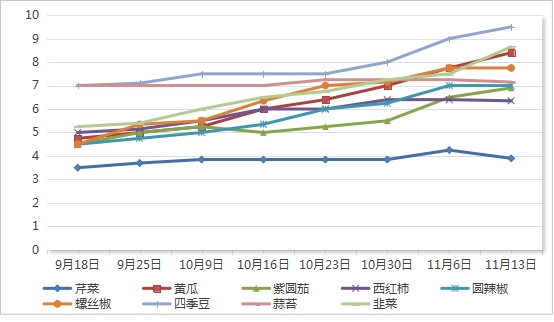 精细菜平均价格7.29元/公斤,与11月6日相比上涨3.55%(4涨3降2平)。其中:韭菜价格8.65元/公斤,与11月6日相比上涨15.33%;黄瓜价格8.4元/公斤,与11月6日相比上涨8.39%;紫圆茄价格6.9元/公斤,与11月6日相比上涨6.15%;四季豆(豆角)价格9.5元/公斤,与11月6日相比上涨5.56%;螺丝椒价格7.75元/公斤,与11月6日相比持平;圆辣椒价格7.0元/公斤,与11月6日相比持平;西红柿价格6.35元/公斤,与11月6日相比下降0.78%;蒜苔价格7.15元/公斤,与11月6日相比下降1.38%;芹菜(西芹)价格3.9元/公斤,与11月6日相比下降8.24%。