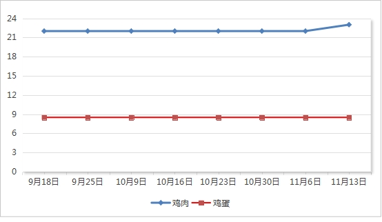 鸡肉平均价格23.0元/公斤,与11月6日相比上涨4.55%;牛奶平均价格5.0元/公斤,与11月6日相比持平;鸡蛋平均价格8.5元/公斤,与11月6日相比持平。