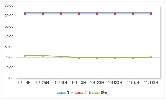 三、猪肉价格与11月6日相比上涨,羊肉、牛肉价格与11月6日相比均持平