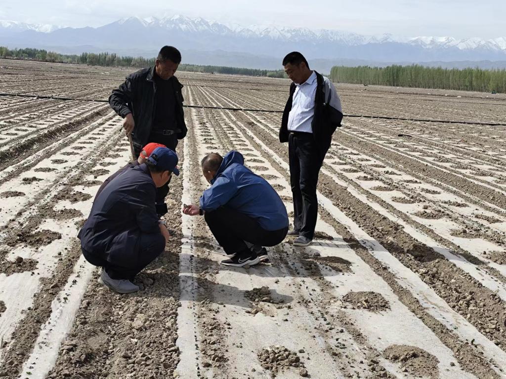 精河县农业技术推广中心要求技术人员在播种期间佩戴小红帽、尺子、勺子、本子和笔,深入到田间地头调查土壤墒情、出苗率、病虫害等,并进行技术指导服务,给棉农讲解当前气候条件、土壤情况、农作物播种等方面提出农作物中耕、化控、病虫害防治、追肥等科学合理的管控建议,指导农户提前做好科学防治,解决农业生产中遇到的疑难杂症,全力以赴保障春耕春播工作开展、力争为精河县农业生产开好局、起好步提供坚实的技术支撑。