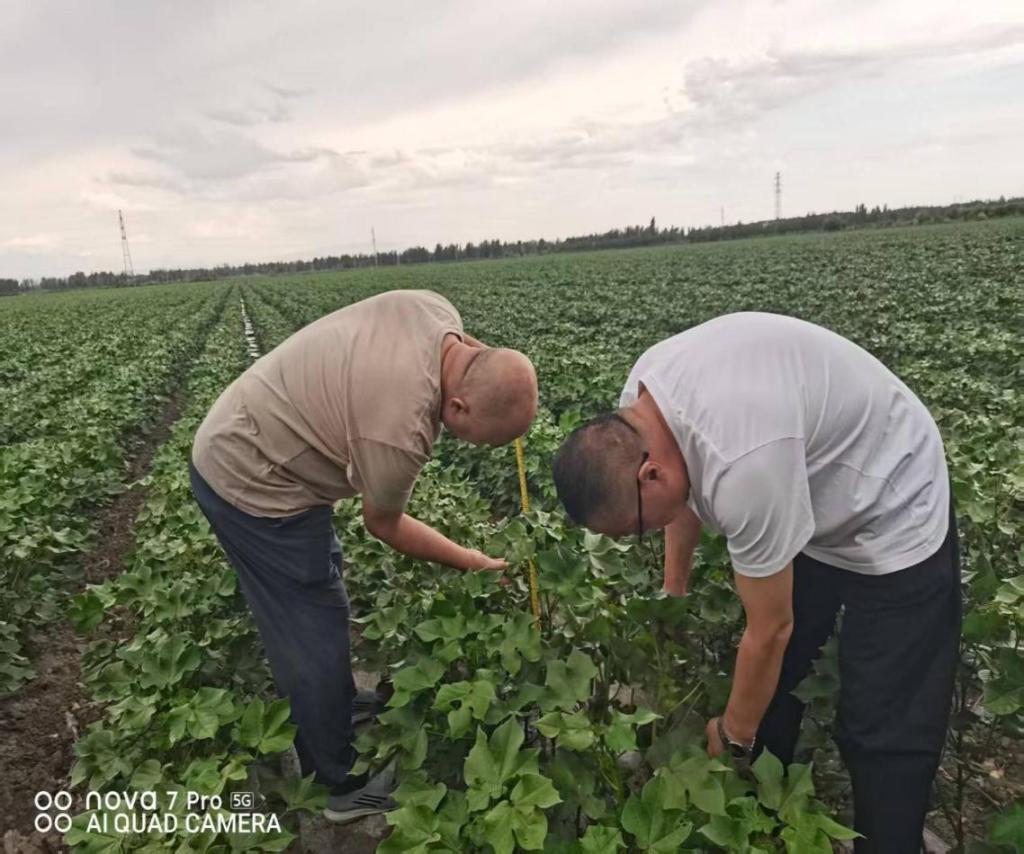 2025年6月12日,精河县农业技术推广中心推广研究员张怀军带领3名技术人员深入八家户及托里镇棉花“百、千、万”示范田。有针对性开展花期田管技术要点指导,在八家户农八队百亩攻关田里,技术人员量棉株高度、数果枝台数、查看病虫害,发现此田棉株有旺长的迹象。推广研究员张怀军当即给农户打电话告知现阶段棉苗对水肥的反应较为敏感,如果水肥过多,特别是氮素过多就会造成棉株疯长,蕾铃大量脱落,所以稳长多现蕾早开花是关键,加强调查,因时因苗开展田管。
