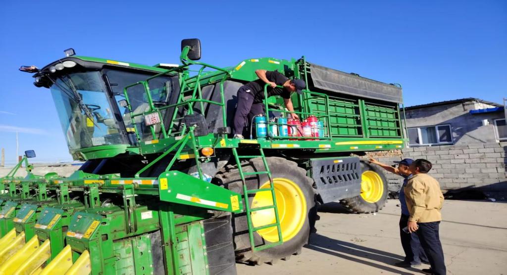 在采收现场,技术人员对采棉机操作规范和安全设施进行了细致检查,针对采棉机调试、维护以及常见故障排除,为农机手进行了专业的现场指导,还着重强调安全生产,要求严格遵守操作规程,杜绝违规作业。针对部分采棉机设备老化、性能不稳定的问题,现场给出改进建议,并迅速协调维修人员进行维修保养,确保设备正常运行。