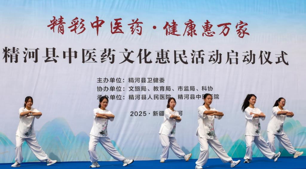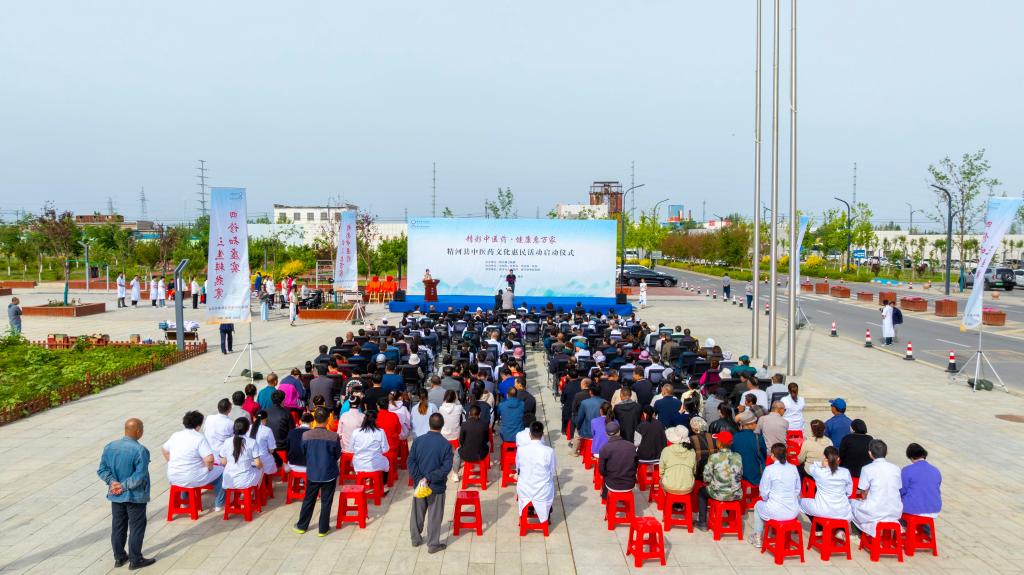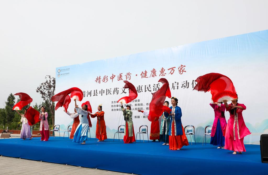 仪式现场,文化表演精彩纷呈。精河原创歌曲《精河岁月》以悠扬的旋律勾勒出精河四季更迭的绝美风光,舞蹈《又见红楼梦》展现了中华文化的独特魅力;《古法养生操》则让观众领略到中医药养生文化的独特魅力,《中药排名赛》互动环节更是将现场气氛推向高潮。