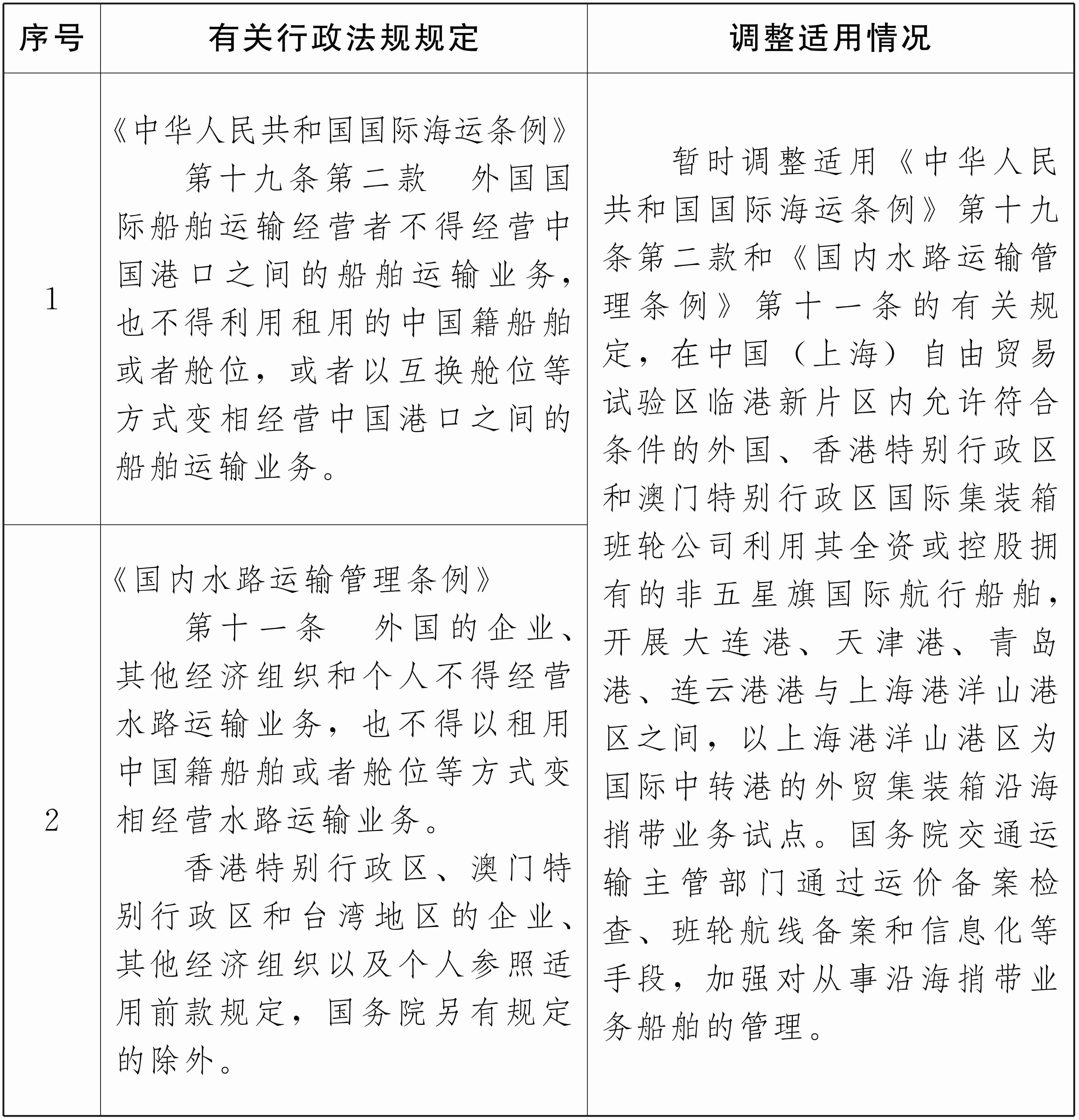 一、按照《国务院关于印发中国(上海)自由贸易试验区临港新片区总体方案的通知》(国发〔2019〕15号),同意自2025年1月1日起至2027年12月31日,在中国(上海)自由贸易试验区临港新片区暂时调整适用《中华人民共和国国际海运条例》、《国内水路运输管理条例》的有关规定(目录附后)。