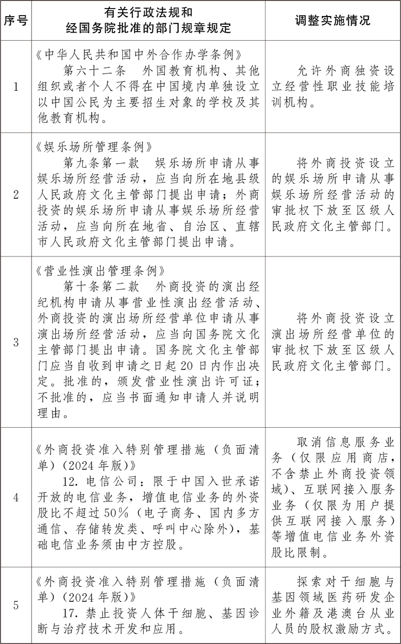 一、按照《国务院关于〈支持北京深化国家服务业扩大开放综合示范区建设工作方案〉的批复》(国函〔2023〕130号),同意自即日起,在北京市暂时调整实施《中华人民共和国中外合作办学条例》、《娱乐场所管理条例》、《营业性演出管理条例》、《外商投资准入特别管理措施(负面清单)(2024年版)》的有关规定(目录附后)。