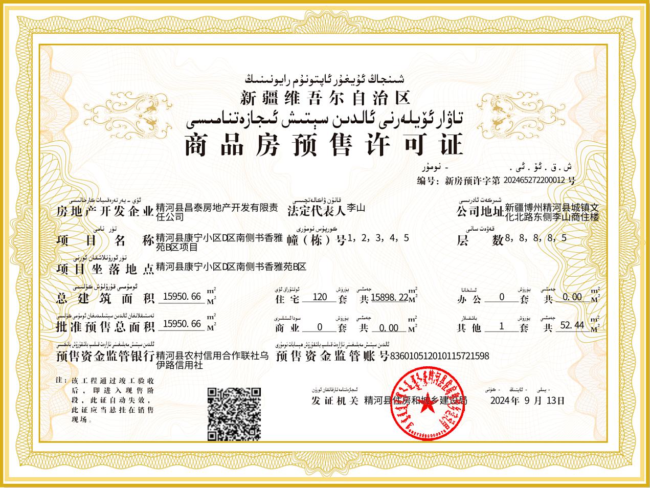 经审核,精河县昌泰房地产开发有限责任公司开发建设的精河县康宁小区D区南侧书香雅苑B区符合《中华人民共和国城市房地产管理法》《城市房地产开发经营管理条例》相关规定,批准该项目预售,商品房预售许可证编号:新房预许字第202465272200012号(详见附件),预售资金监管账户是:836010512010115721598,监管银行为:精河县农村信用合作联社乌伊路信用社,现予公告。