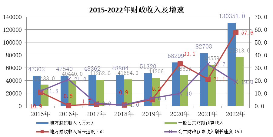 2022年,精河县地方财政收入累计完成130351万元,同比增长57.6%;其中,公共财政预算收入完成76813万元,同比增长19%,税收收入完成40608万元,同比增长44.8%;非税收入完成36205万元,同比下降0.7%,基金收入完成53538万元,同比增长195.1%。