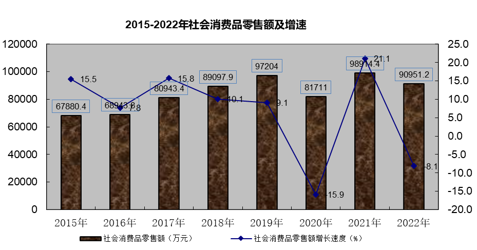 全年地方社会消费品零售总额实现9.1亿元,同比下降8.1%。按经营地统计,城镇消费品零售额8.35亿元,同比增长9.4%,乡村消费品零售额0.74亿元,同比下降90.3%,按消费类型统计,商品零售额6.04亿元,同比下降16.4%,餐饮业营业收入2.6亿元,同比增长0.6%。