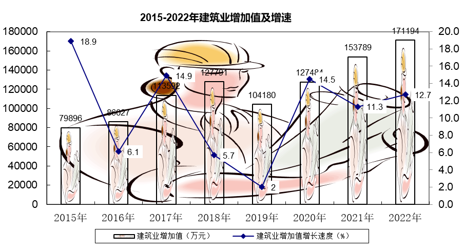 全年全部建筑企业完成建筑业增加值17.11亿元,同比增长12.7%。精河县地方现有法人建筑企业8家,2022年共签订建筑合同19.91亿元,同比增长117.8%,其中:本年新签订合同金额18.74亿元,同比增长163.8%,完成建筑业总产值9.37亿元,同比增长30.8%,其中:建筑工程产值9.37亿元,同比增长35.7%;实现竣工产值8.32亿元,同比增长35.5%,从事建筑业活动的平均人数1958人,同比增长25.6 %,房屋竣工面积7.78万平方米,同比下降18.9%。