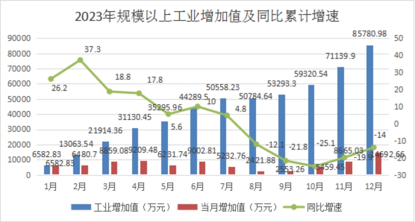 1-12月,全县规模以上工业企业实现增加值8.58亿元,同比下降14%,降幅较1-11月收窄5.9个百分点。其中:12月当月实现增加值1.47亿元,同比增长14.6%。