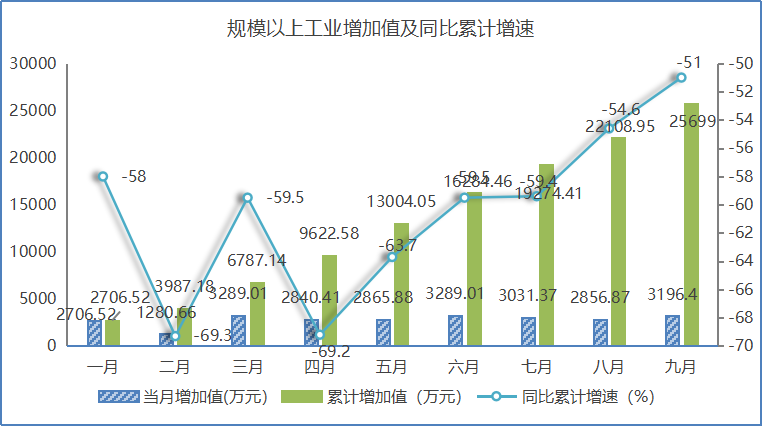 1-9月,全县规模以上工业企业实现增加值2.57亿元,同比下降52.1%,较1-8月降幅收窄2.5个百分点,其中:9月当月实现增加值0.32亿元,同比增长8.6%。