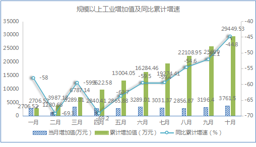 1-10月,全县规模以上工业企业实现增加值2.95亿元,同比下降44.8%,较1-9月降幅收窄7.3个百分点,其中:10月当月实现增加值0.38亿元,同比下降27.8%。1-10月全县规模以上工业发展呈现以下特点: