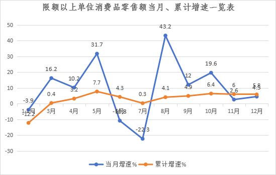 2024年限额以上批发业实现销售额24亿元,同比增长15%,增速较1—11月下降9个百分点,当月实现销售额5.2亿元,同比下降8.3%;限额以上零售业商品销售额实现2.2亿元,同比下降4.3%,增速较1-11月收窄0.3个百分点,当月实现销售额0.2亿元,同比下降1.1%。