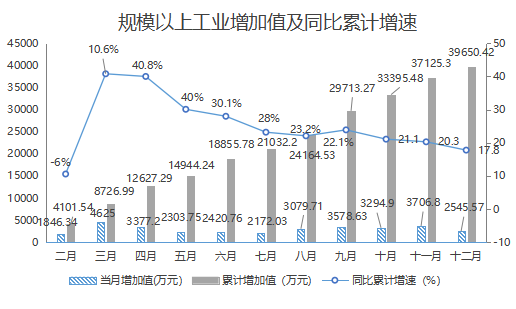 1-12月,精河县规模以上工业企业完成工业产值13.85亿元,实现增加值3.97亿元,同比增长20.1%,低于全州(20.6%)0.5个百分点,增速列全州第3位。较1-11月回落0.2个百分点。其中:12月当月实现增加值0.25亿元,同比增长17.2%。