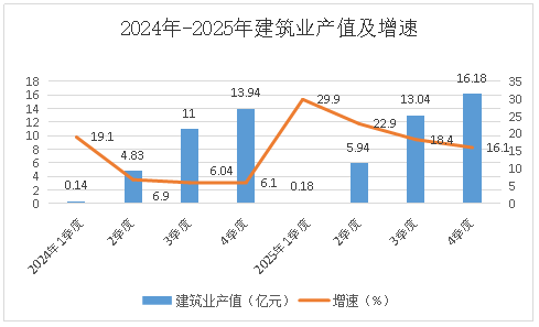 ㈠产值稳步增长,发展韧性凸显。全年建筑业产值达16.18亿,同比增长16.1%,较上年增速大幅提升,精河县建筑业发展动力持续增强,产业规模稳步壮大,为县域经济增长提供有力支撑。