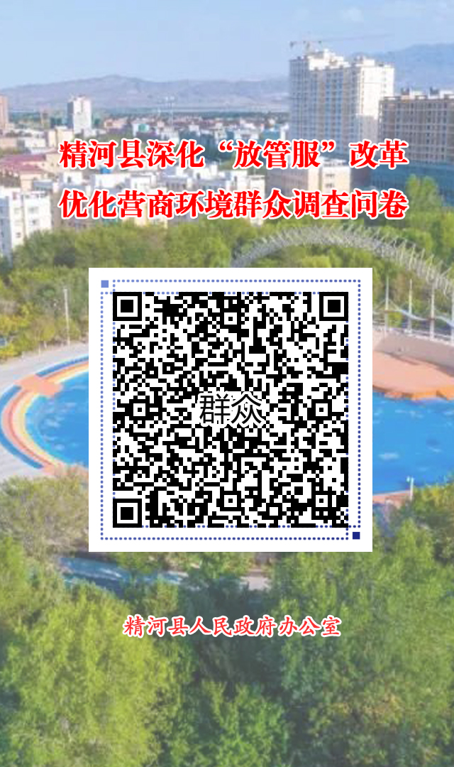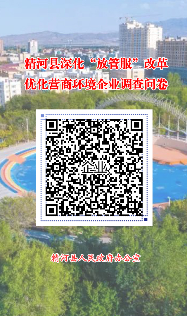 为深入了解精河县营商环境基本情况,进一步推动全县上下强作风、优服务、提效能,助推全县经济社会又好又快发展,请您抽出宝贵时间扫描下方二维码,填写《精河县优化营商环境企业(群众)调查问卷》,我们将认真梳理分析您提出的宝贵意见,共同促进全县营商环境优化提升。