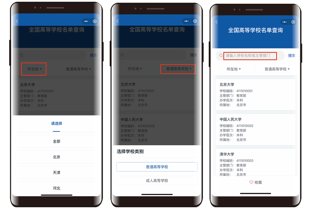 你可以通过选择【所在地】或切换【普通高等学校/成人高等学校】,来筛选感兴趣的高校;