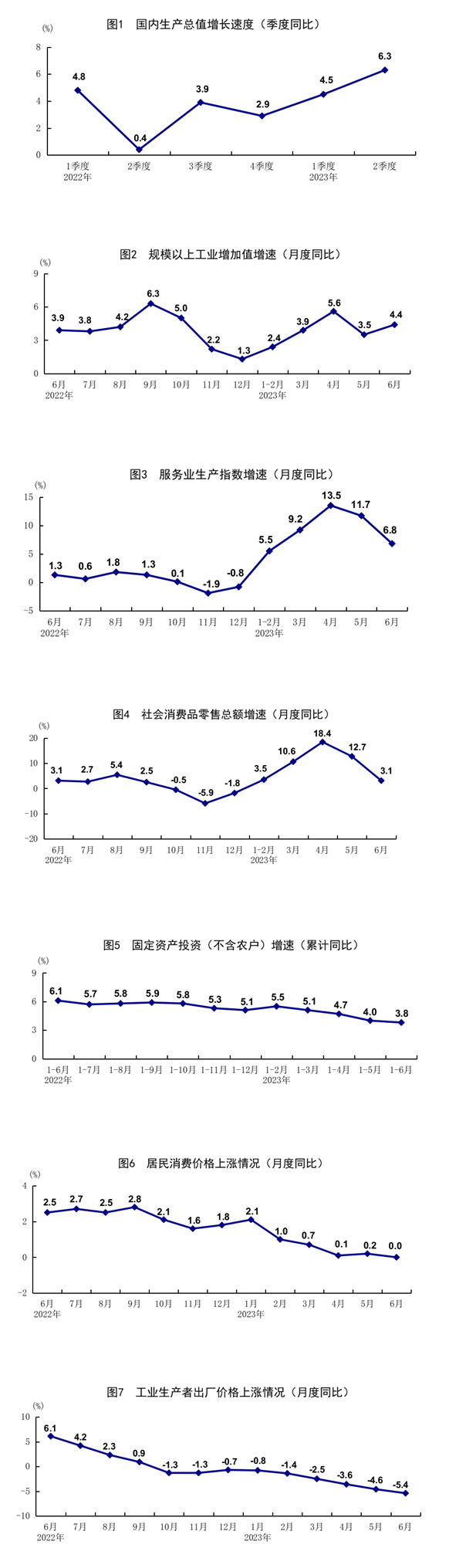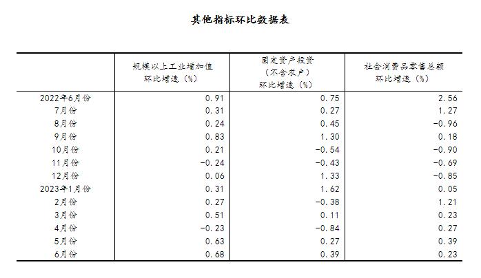 (2)根据季节调整模型自动修正结果,对近一年来各期国内生产总值、规模以上工业增加值、固定资产投资(不含农户)、社会消费品零售总额环比增速进行修订。修订结果及2023年二季度GDP环比数据、2023年6月份其他指标环比数据如下: