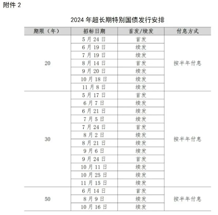 从“日程表”看,自5月中旬持续至11月中旬,20年、30年和50年超长期特别国债将分别发行7期、12期、3期,首发日期分别为5月24日、5月17日、6月14日。
