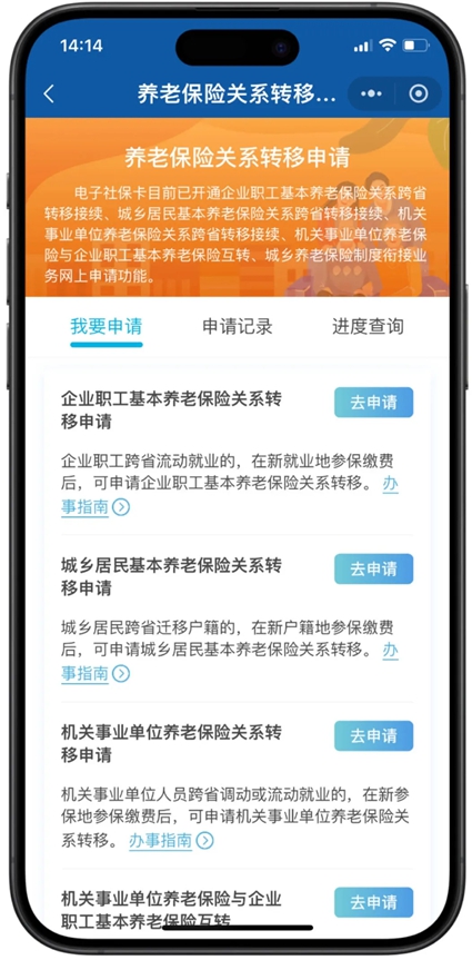 进入“养老保险关系转移申请”服务,领取“电子社保卡”(如已领取可忽略),进入申请入口,根据参保险种选择办理通道。