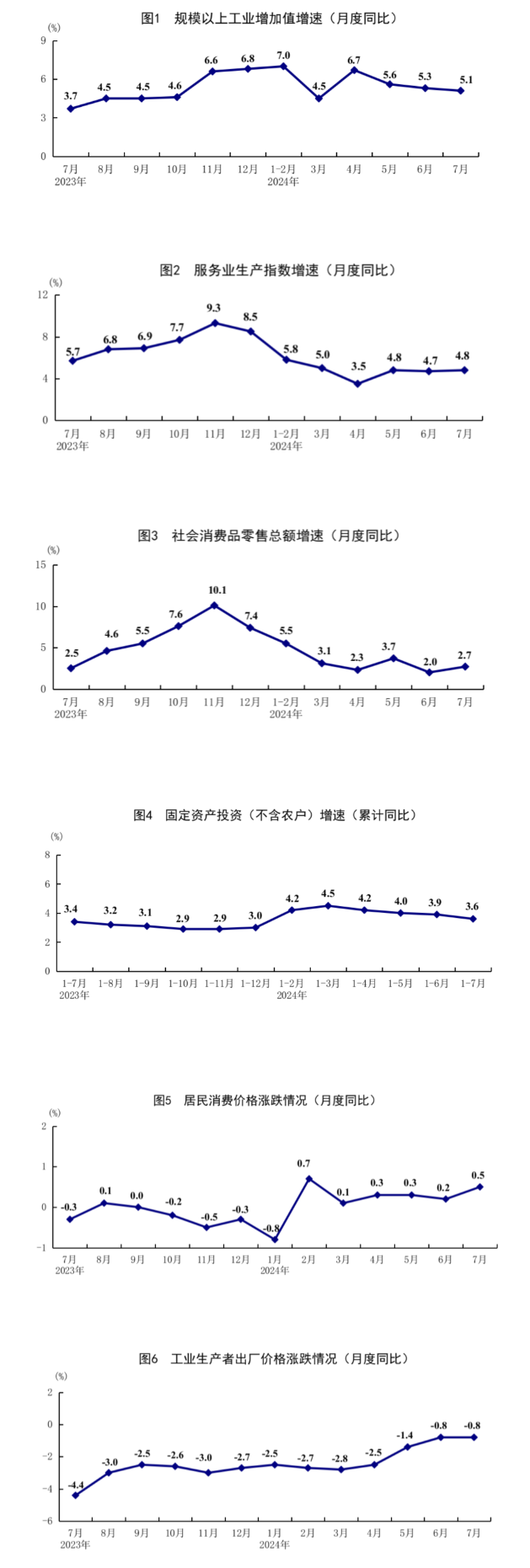 7月份,全国规模以上工业增加值同比增长5.1%,比上月回落0.2个百分点;环比增长0.35%。分三大门类看,采矿业增加值同比增长4.6%,制造业增长5.3%,电力、热力、燃气及水生产和供应业增长4.0%。装备制造业增加值增长7.3%,高技术制造业增加值增长10.0%,分别比上月加快0.4和1.2个百分点。分经济类型看,国有控股企业增加值同比增长3.5%;股份制企业增长5.4%,外商及港澳台投资企业增长4.2%;私营企业增长5.2%。分产品看,新能源汽车、集成电路、3D打印设备产品产量同比分别增长27.8%、26.9%、25.3%。1—7月份,全国规模以上工业增加值同比增长5.9%。7月份,制造业采购经理指数为49.4%,企业生产经营活动预期指数为53.1%。1—6月份,全国规模以上工业企业实现利润总额35110亿元,同比增长3.5%。