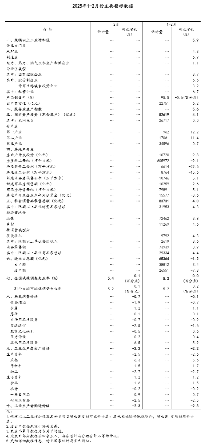 1—2月份,全国规模以上工业增加值同比增长5.9%,比上年全年加快0.1个百分点。分三大门类看,采矿业增加值同比增长4.3%,制造业增长6.9%,电力、热力、燃气及水生产和供应业增长1.1%。装备制造业增加值同比增长10.6%,比上年全年加快2.9个百分点;高技术制造业增加值增长9.1%,加快0.2个百分点。分经济类型看,国有控股企业增加值同比增长3.7%;股份制企业增长6.6%,外商及港澳台投资企业增长3.2%;私营企业增长6.7%。分产品看,新能源汽车、3D打印设备、工业机器人产品产量同比分别增长47.7%、30.2%、27.0%。从环比看,2月份规模以上工业增加值比上月增长0.51%。2月份,制造业采购经理指数为50.2%,比上月上升1.1个百分点;企业生产经营活动预期指数为54.5%。