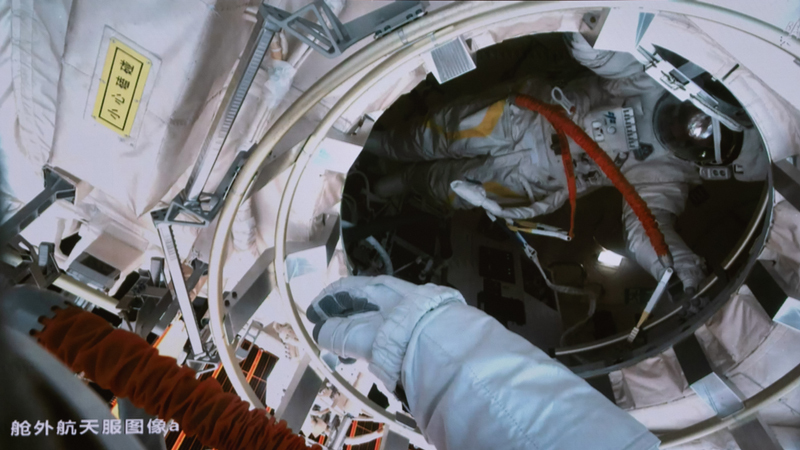 这是9月25日晚在北京航天飞行控制中心屏幕上拍摄的神舟二十号乘组航天员王杰在空间站组合体舱外作业的画面。新华社记者 李明刚 摄
