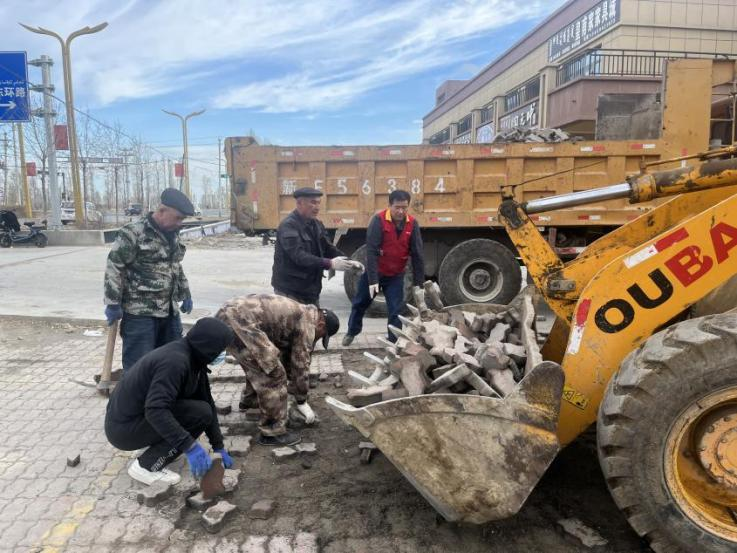 “精河县城水系建设项目将要开工,要将沿街铺设的彩砖更换为大理石。”工作队在得知这一消息后,立刻与村“两委”商讨,共同制定美丽乡村建设规划,工作队队长、第一书记申学军积极与精河县住建局联系沟通,协调了5万块旧彩砖和300块旧路沿石,计划将其用于铺设新庄村巷道。4月11日,“访惠聚”工作队员自己动手,顶着6、7级大风,撬砖、搬砖,联系铲车、翻斗车,雇用人工,将位于精河县城团结路与环城北路交岔路口南侧的5万块旧彩砖安全运到村里,为日后开展道路建设和美化环境提供了物质基础。